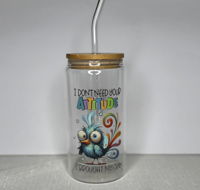 I DON'T NEED YOUR ATTITUDE BIRD FUNNY NOVELTY GLASS JAR TUMBLER CUP WITH LID, STRAW, BRUSH