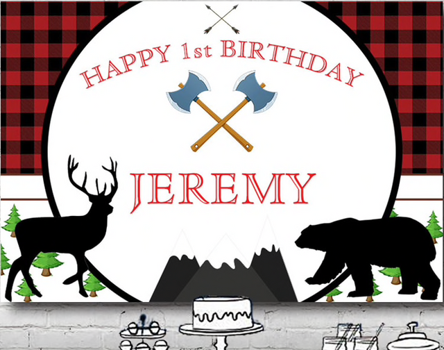 LUMBERJACK WOODS PERSONALISED BIRTHDAY PARTY BANNER BACKDROP DECORATION - a. 90cm x 150cm (3ft x 5ft) is backordered and will ship as soon as it is back in stock.